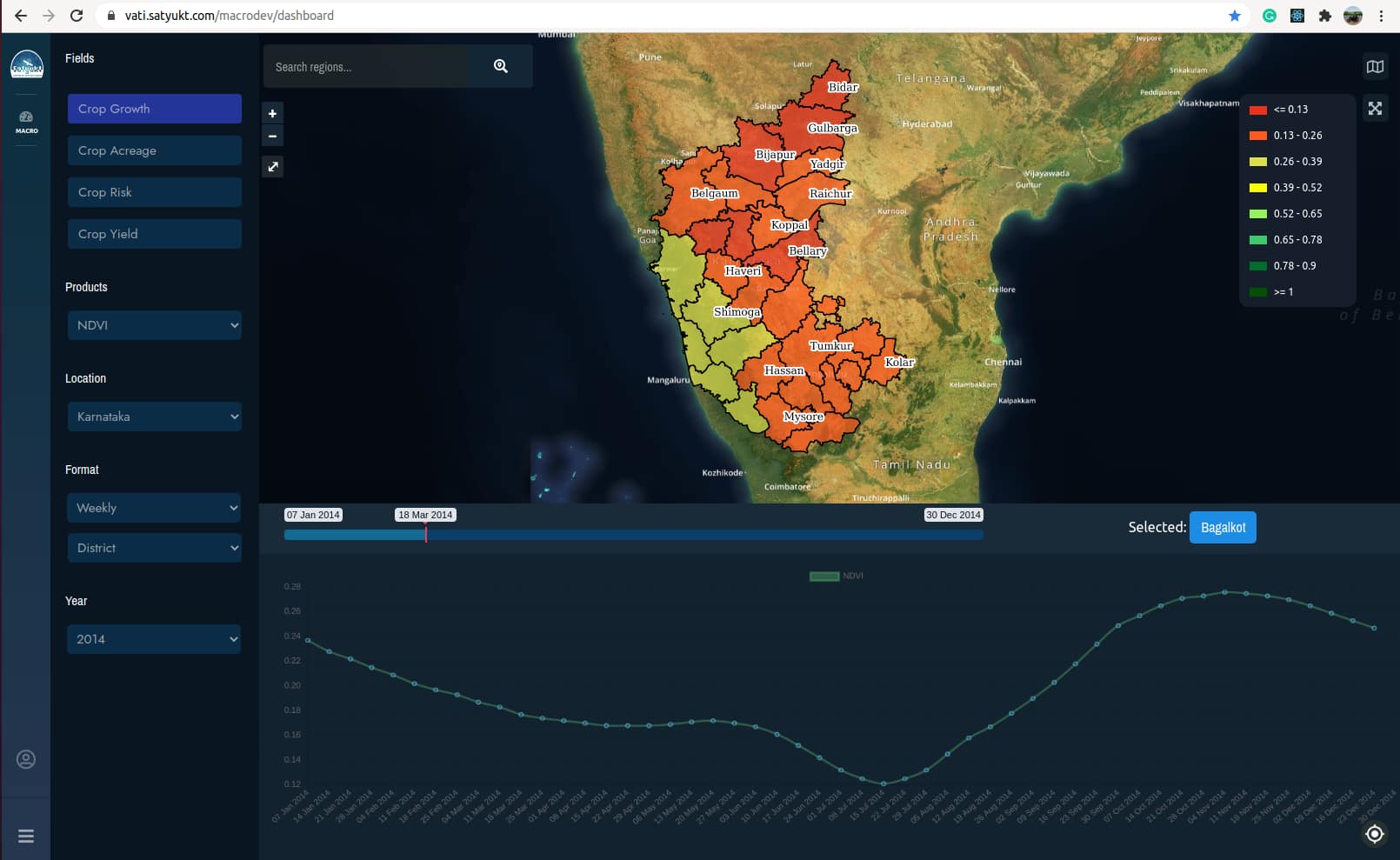 Choose NDVI from the available products and select a location to continue. All of these locations have data in various formats. For example, we have data in the district level, village level as well as seasonal formats. So, for the purpose of the demo here we select Karnataka and display the district level NDVI data.