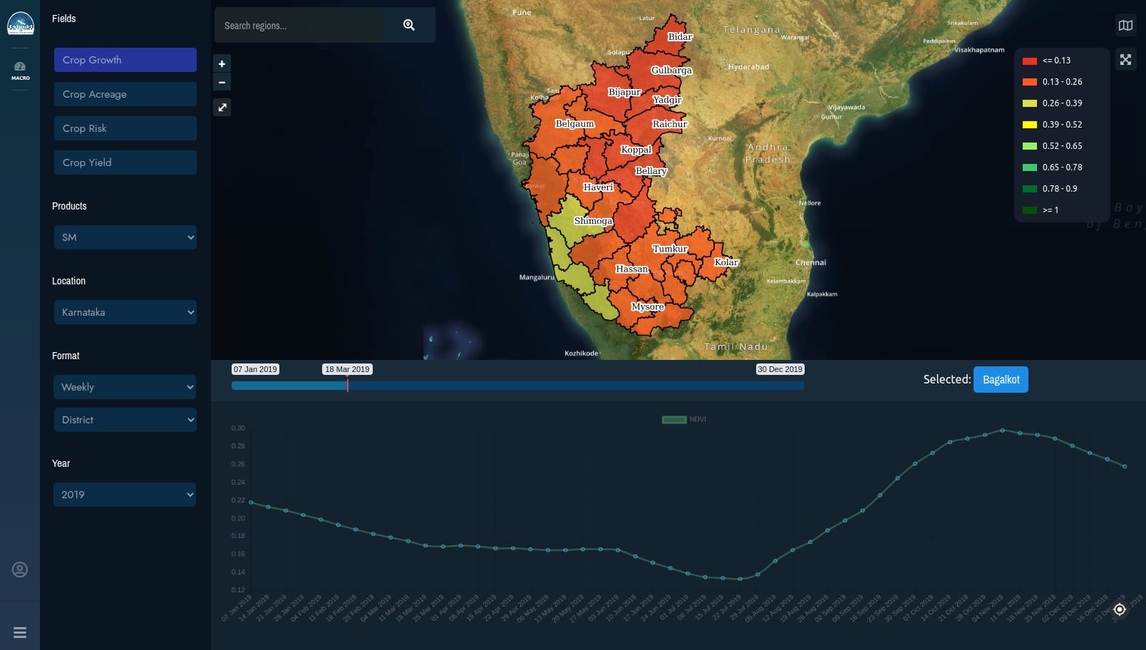 Crop growth or crop health monitoring is used to analyze the various stages of a crop with satellite-based imagery for a given duration. This data can be further monitored and compared with historical data which helps us for making proper decisions for better performance of the crop in the future.