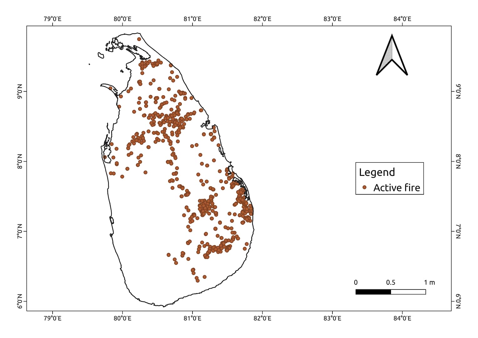 In Sri Lanka the crop residue burning intensifies mainly in June, July and reaches the maximum in August as it is the harvesting period 3. The above image shows the active fire over entire Sri Lanka in August 2018. The number of fires detected is more during this period due to the crop residue burning. The satellite data can be used to detect and monitor these activities.