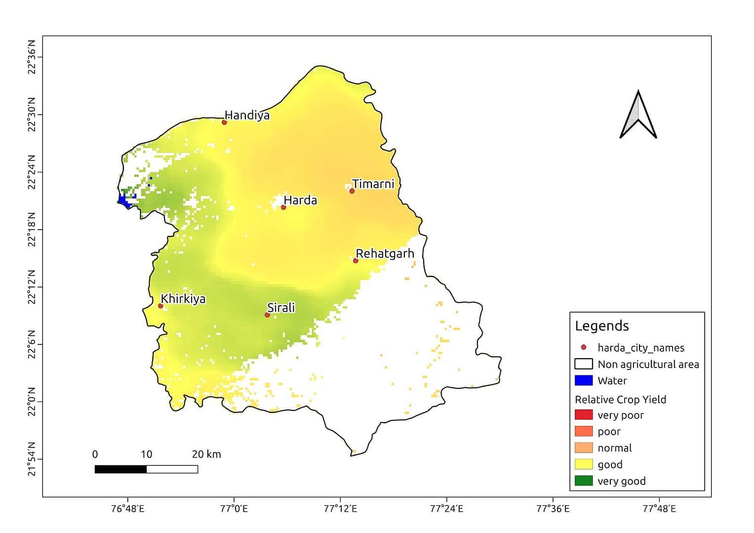 Here at Satyukt, by using multi-satellite data we estimate the relative crop yield. The above map shows the same estimation for Harda district of Madhya Pradesh. Relative yield is indicated as qualitatively for wheat in the rabi season. We can see that the relative crop yield of wheat is good in most of the places and very good in some places.