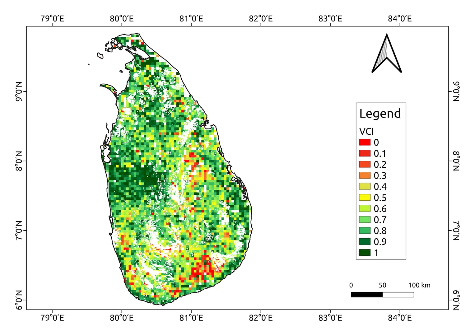 The above map shows the VCI map of Sri Lanka masked over urban areas for 1st January 2020.