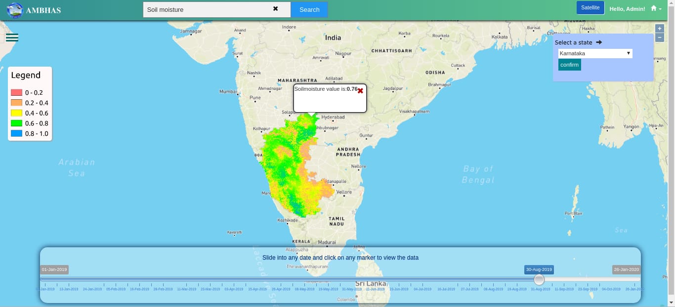 For example, you selected Karnataka from the available states. As a result, soil moisture data of Karnataka will be added to the base map. Also, we have added a slider to view the older data. For that, change the slider into a specific date and the map will be updated with that specific date. Apart from these users can also view the of a specific location by clicking on the map.